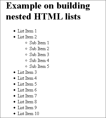An unordered list starts with the <ul> tag. Each list item starts with the <li> tag.The list items will be marked with bullets (small black circles) by default: