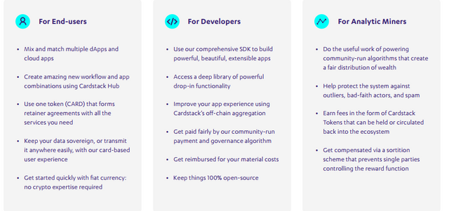 - Developers who are paying their fees to be able to offer their cards on the plattform and also later beeing able to get rewards, if the end-user decides to use the offered card feature.