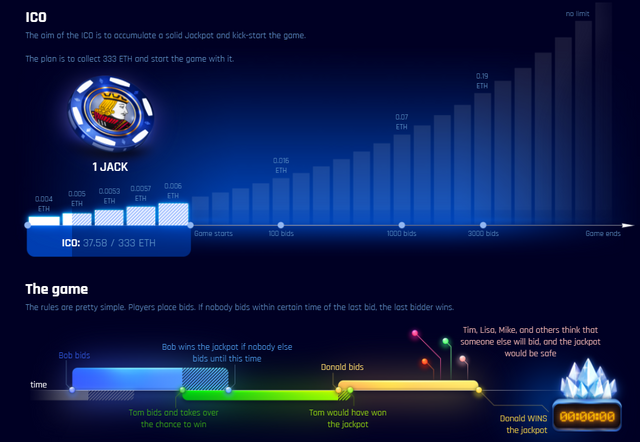 - Players bid sequentially, using a defined amount of ethereum or native Jack tokens. I bid, u bid, she bids. A certain timeout duration is allocated after each bid. If someone else bids during the duration, the clock restarts. IF NO ONE ELSE BIDS during the period, the jackpot goes to the last bidder!!