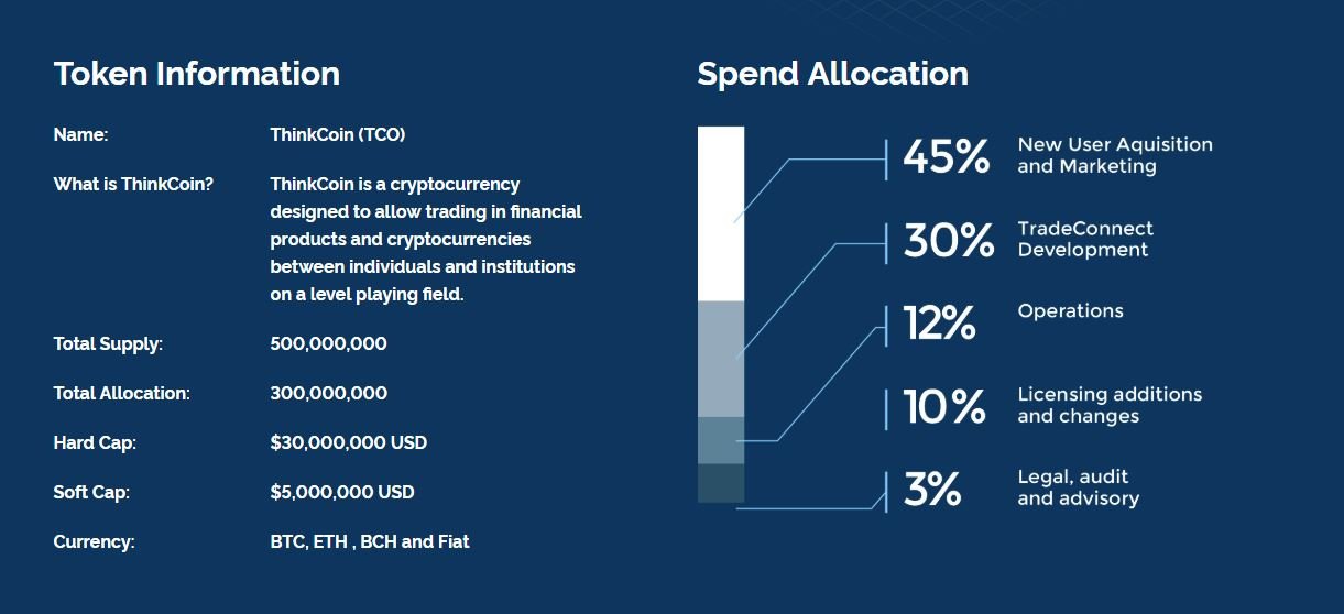 The ThinkCoin is a digital currency that supports TradeConnect network. ThinkCoin can operate currencies, commodities, stocks and other financial products in a simple, safe and easy-to-use way, by providing operations to the blockchain, The TCO can be acquired through one of our disclosure stages prior to PRE-ICO and ICO or, once the ICO is completed, through the exchange of fiduciary currency and other cryptographic currency through some exchanges.
