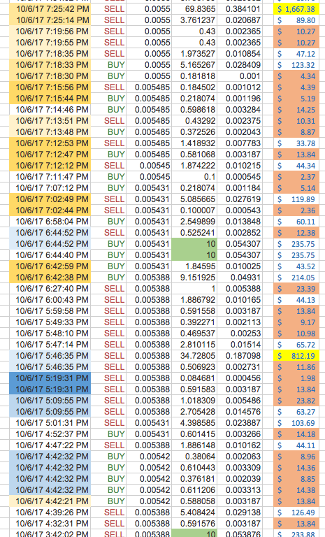 First off humans typically do not enter multiple trades in the same second. We are too slow. If you look at the trades, and I offer some color coding to help out, lots of them were all entered in the same second or in the same minutes. Some of these trades may be the result of a split order, where one buy order bought out multiple sell orders, but at the moment lets just call this suspect.