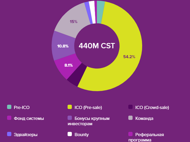 Максимальное количество CST токенов - 440 миллионов (100%). Токены будут распределены следующим образом:
