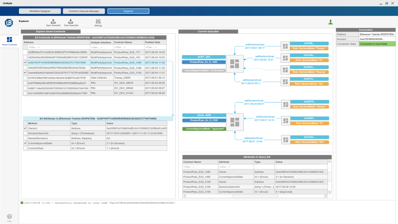 Kontrak cerdas yang ada dipantau oleh Unibright Explorer. Aliran transaksi dan informasi divisualisasikan.