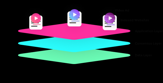The data layer is the foundation of the Vidy Ad distribution platform, concurrently communicating with the application consensus layers, and transparently maintaining all incoming data in the immutable Vidy ledger. The data layer maintains a record of all embed placements, hold times, VidyCoin payouts, VidyCoin staked balances, and all VidyCoin transactions via the application layer’s one-tap purchase modal.