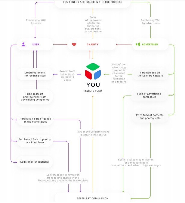 The SELFLLERY economic model is based on an internal asset, the SELFLLERY money utility token (YOU token). The YOU token entitles its holders access to paid services on the SELFLLERY platform, to make purchases in the SELFLLERY marketplace and stock gallery, donate to charities, and make internal transfers and withdraw tokens to Ethereum wallets.