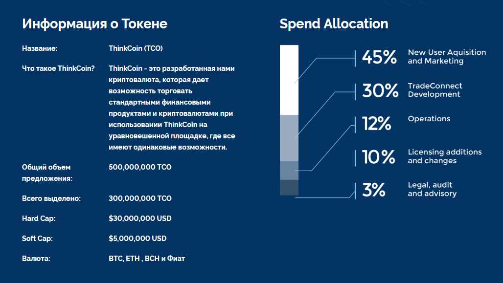 ThinkCoin – это криптовалюта, используемая для создания TradeConnect – одноранговой сети, которая использует технологию BlockChain, чтобы помочь инвесторам быстро и легко торговать несколькими инструментами. Это экономит время и затраты.