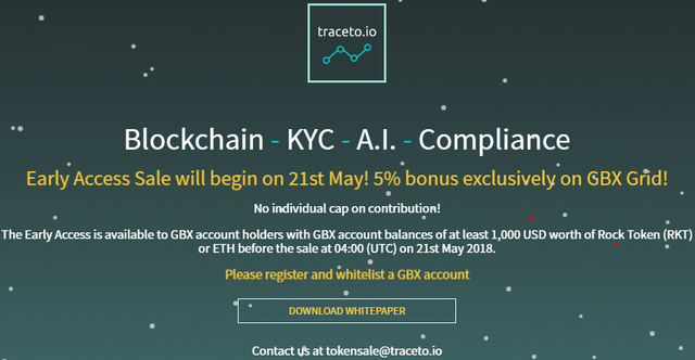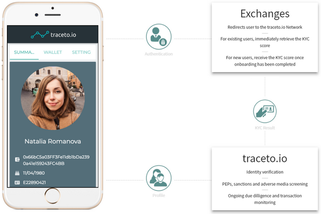 TRACETO.IO creates the solution for the KYC. The team-designed framework works on the four basic questions; Who are you, who are you not, what have you done and are you still who you say it is you? Intelligent technologies for contracts and artificial intelligence are used to develop the TRACETO.IO network. The user uses the decentralized app if he wants to join the ICO or an exchange. The identity documents are uploaded by the user on the platform. The documents are encrypted and stored in the application. For viewing these documents the permission of the user is required. Face recognition, OCR, video recognition are used as the means to check the profile.