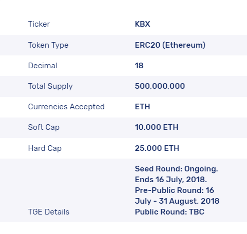 The name of the new coin is KBX. A total of 500 million KBX tokens are planned in the system, the price of one token is 0.00011 ETH. You can buy tokens for ETH and BTC. Soft-cap project – 10 thousand ETH, the top bar of sales – 25 thousand ETH.