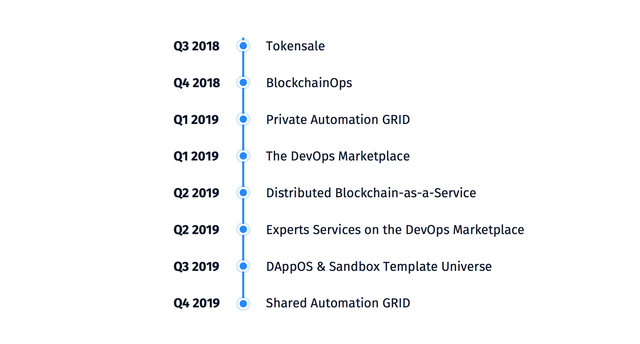 Development of the platform began in the third quarter of 2016. Since then, a version of the platform for enterprises has been launched, which received regular updates. After the ICO, the development of the BlockchainOps module will be completed at the end of 2018. The following modules are planned to be developed and launched in 2019: Private Automation GRID, DevOps Marketplace, Distributed blockchain, dAppOS and Shared Automation GRID.