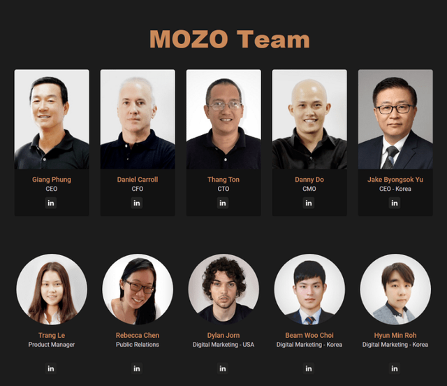 Mozo bergerak maju dengan tim inti yang terdiri dari Giang Phung, CEO - seorang veteran industri teknologi, Daniel Caroll CFO - seorang ahli dengan 30 tahun pengalaman di sektor teknologi dan layanan, Thang Ton, CTO - sistem terdistribusi dan ahli semikonduktor, Danny Do, CMO - kapitalis ventura dan pendiri beberapa perusahaan perangkat lunak yang terkait dengan pendidikan dan media, dan CEO yang bertanggung jawab atas Korea Jake Byongsok Yu.