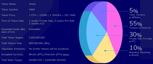 Что касается внутреннего жетона, позвольте мне сообщить вам, что с его помощью клиенты могут делиться своей информацией, и в то же время получать лучшее, чем в среднем, вознаграждение за сделанную исключительную субстанцию. На случай, если мы поговорим о токене более подробно, он создан на основе блокчейна Waves и передается якобы изображением - VIMX. В общей сложности дизайнеры разряжают 2 миллиарда монет, из них доступные для покупки будут доступны только 30% процентов, 55% останутся для возможного последующего использования, а оставшаяся часть монет будет распространена между группой создателей, членами изобилия и продвигающая организация. Базовая оценка самих монет оценивается следующим образом: 1 ETH = 10 000/1 WAVES = 167 VIMX.