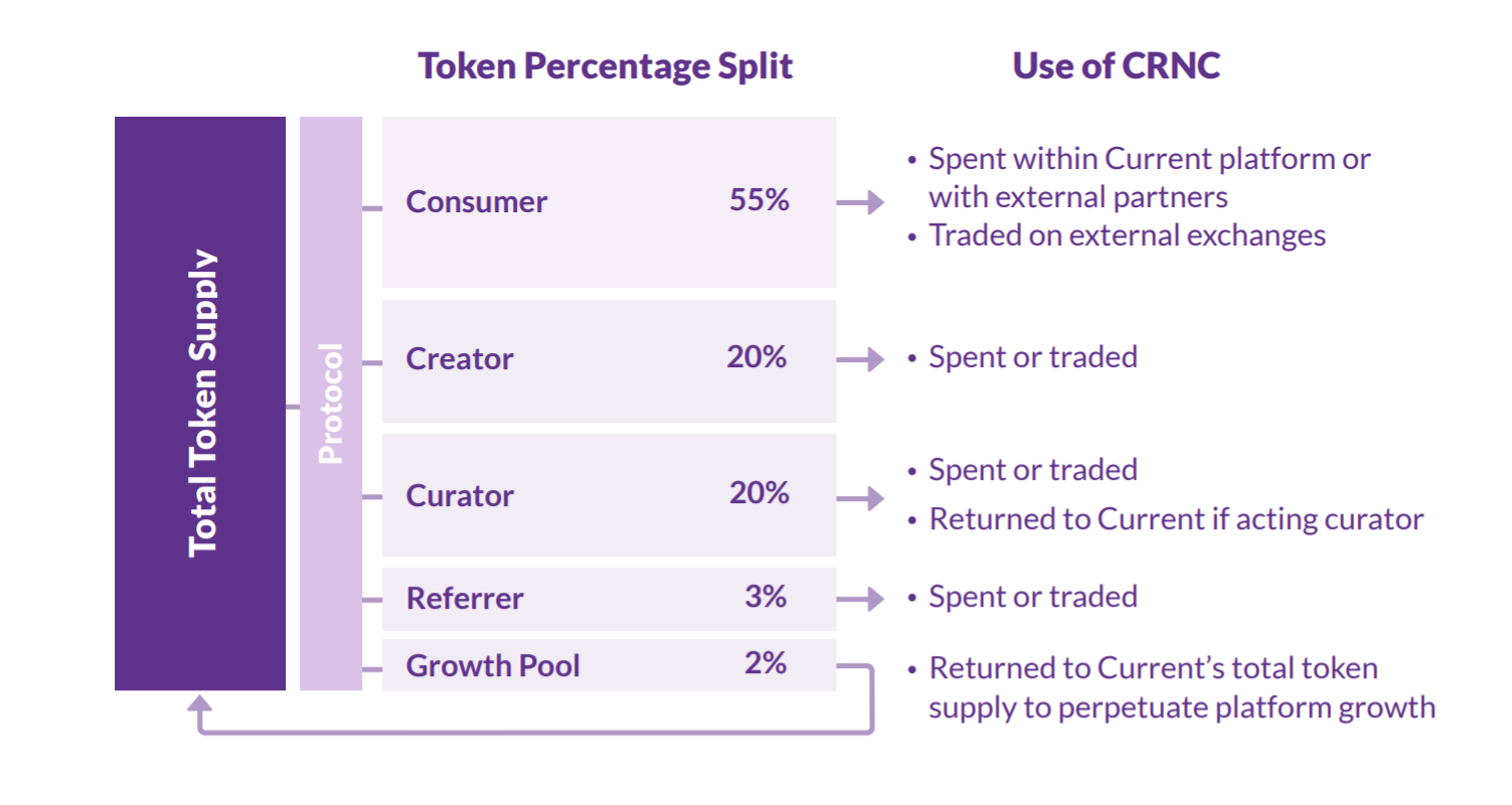 CURRENT tokens (CRNC) are used to fuel the CURRENT ecosystem. It's main function is to reward users based on their activity on different social media platforms. Creators and curators are rewarded equally in a fair manner. CRNC tokens are built on ethereum platform and have a total fixed supply of 1 Billion. Tokens are created in such a way to support forks in the future that will create subtokens for each individual social media platforms. The value of each subtokens would be different and it solely depends on the content generated within the platform.