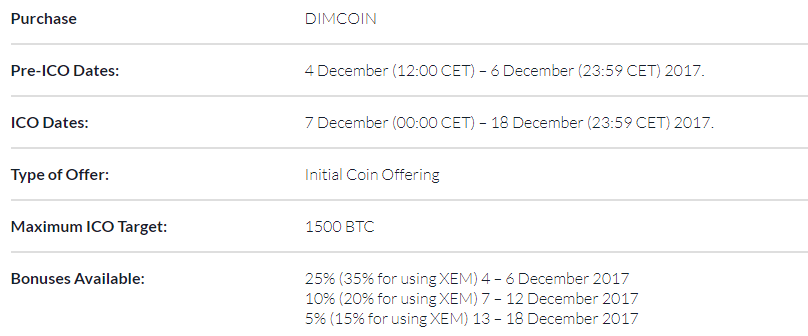 18 December 2017 (23:59 UTC) with 20% Bonus for XEM users and 10% ETH / BTC users. Current price per DIMCOIN: $0.04