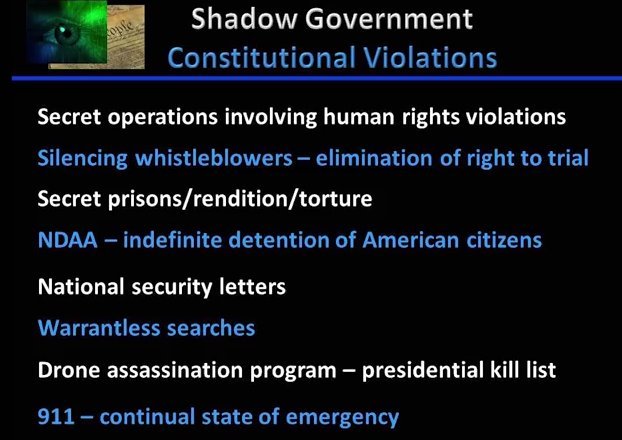 A quintessential component of the Shadow Government grasp on the Federal Government lies with the Constitutional violations it has demonstrated over the years. Shipp states many related examples in this section many of which are included in the corresponding slide below with a major one being their control over Congressional hearings; we have seen this time and time again over the past decades. The wrongdoers are often grilled at these hearings; but nobody ever gets any real form of punishment for these criminal and unconstitutional acts. It’s quite embarrassing to say the least, and merely shows the world how the rule of law is a complete farce in the US Judicial System as it pertains to keeping these traitors accountable.