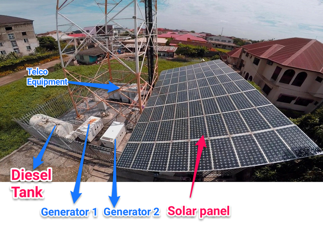We have a lot of sunshine. Some of the BTS run a hybrid system, solar and generator. The solar is not the main power, kinda acts like a backup when there's a change over or emergency maintenance of the generators. I think the sole reason they do this may have to do with efficiency, cost, and space. Some of these sites require a lot of power but have limited space. Most sites are less than 10m square. The one you see in the picture below is believed to be big.