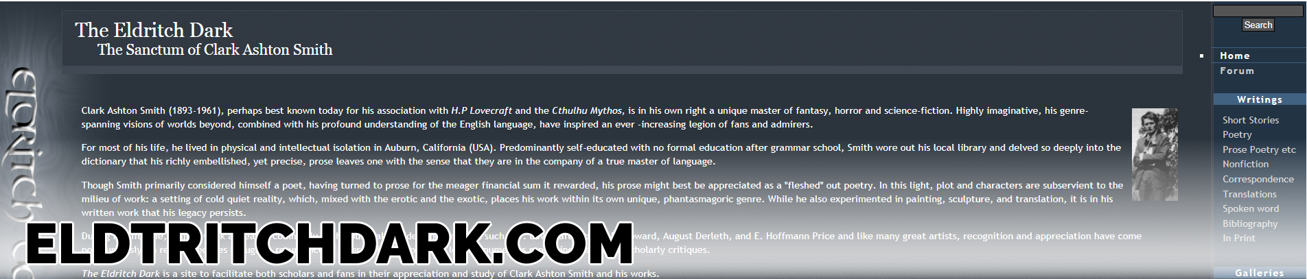 Do you enjoy Lovecraft? Does the Cthulhu Mythos fascinate you? What about the "Weird"? Well, you may rather like this website about the writer Clark Ashton Smith, who, alongside H.P. Lovecraft and Robert R. Howard, defined weird fiction, cosmic horror, and created the Cthulhu Mythos.