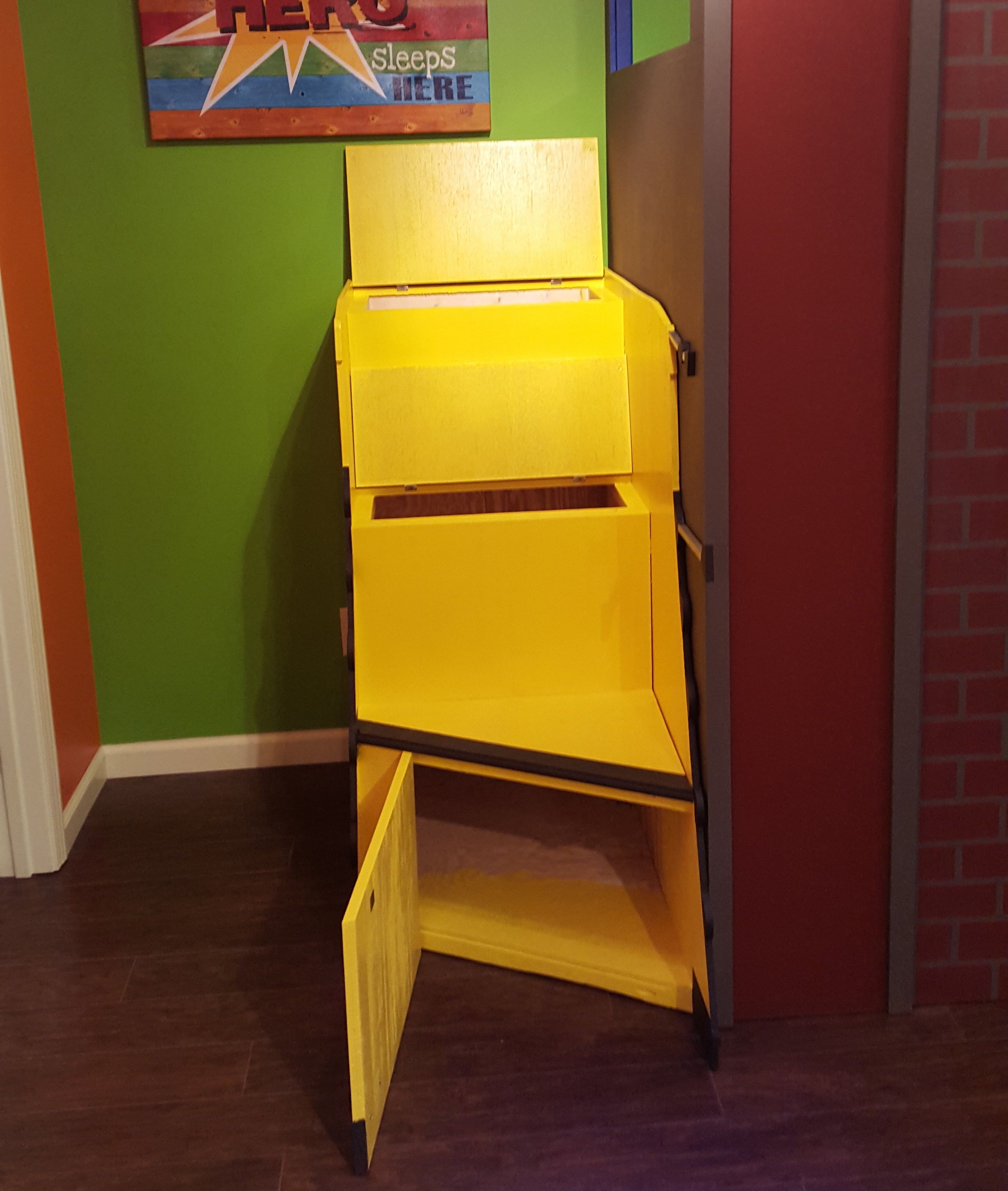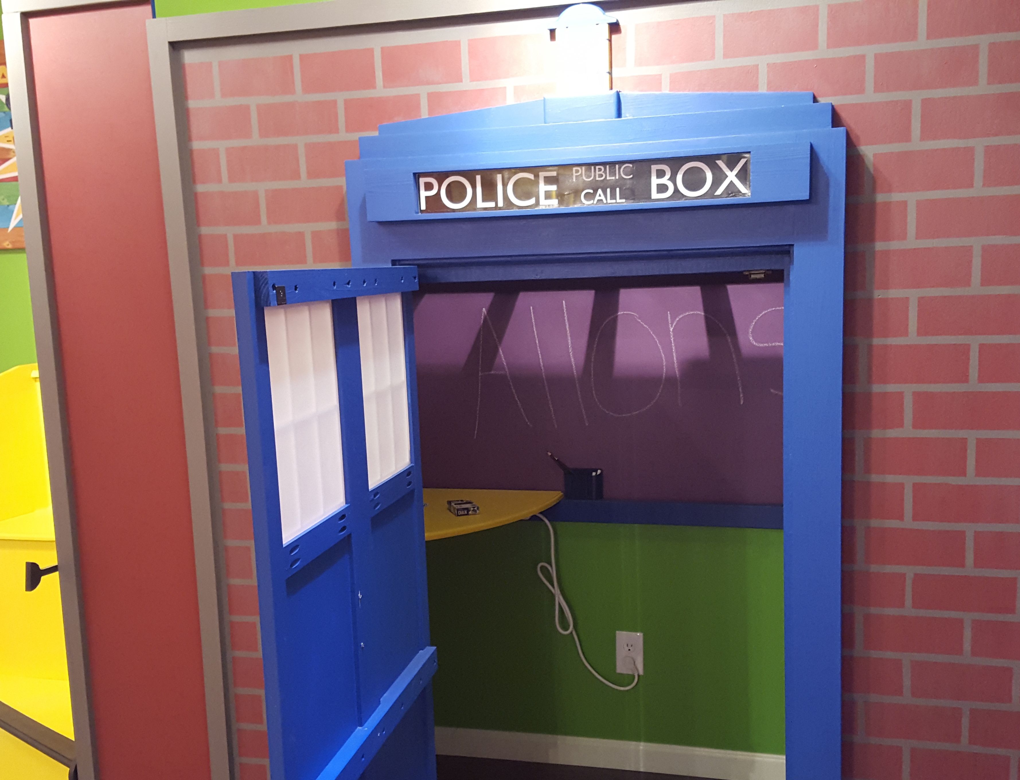 Complete with a desk, bookshelves and purple magnetic blackboard inside. It really is bigger on the inside….