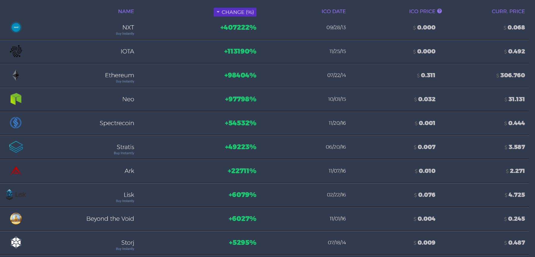 Immense Profit Potential: Many in the space want to invest in the “next Bitcoin”, potentially riding the wave of buying coins at pennies on the dollar and selling them later at an astronomical valuation. Most ICOs have only a conceptual white paper with little to no proof of concept, thereby validating a high payoff potential due to the extremely high-risk investors are taking. Just look at the returns if you were to invest in the ICOs below: