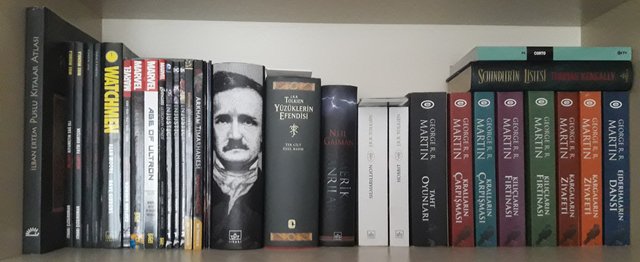 I think this shelf most geek shelf than others. There was comic books (most of DC Comics), LoTR books, A Song of Ice and Fire books (fuck GoT, love book) and E.A.POE's all stories!