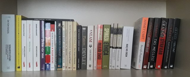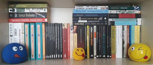 This shelf's books mostly Turkish and famous. For example, Tutunamayanlar, Kinyas ve Kayra, Kürk Mantolu Madonna, Aylak Adam, Cemile, İnce Memed etc. And these emojies are gifts and from my 22nd birthday. I'm still keeping them. Thank's btw. (Yes, these gifts are from a girl.)