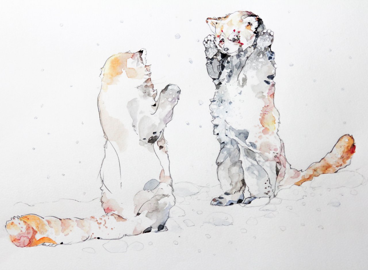 As a little introduction, I’ve included a few drawings of some festive Red Pandas I made recently. Did you know that Red Pandas are agile and acrobatic creatures, who love to play in the snow, and use their long bushy tails for balance? They’re native to the Eastern Himalayas and Southwestern China, but are currently endangered. I was blown away by their cuteness and thought they deserved some painting attention.
