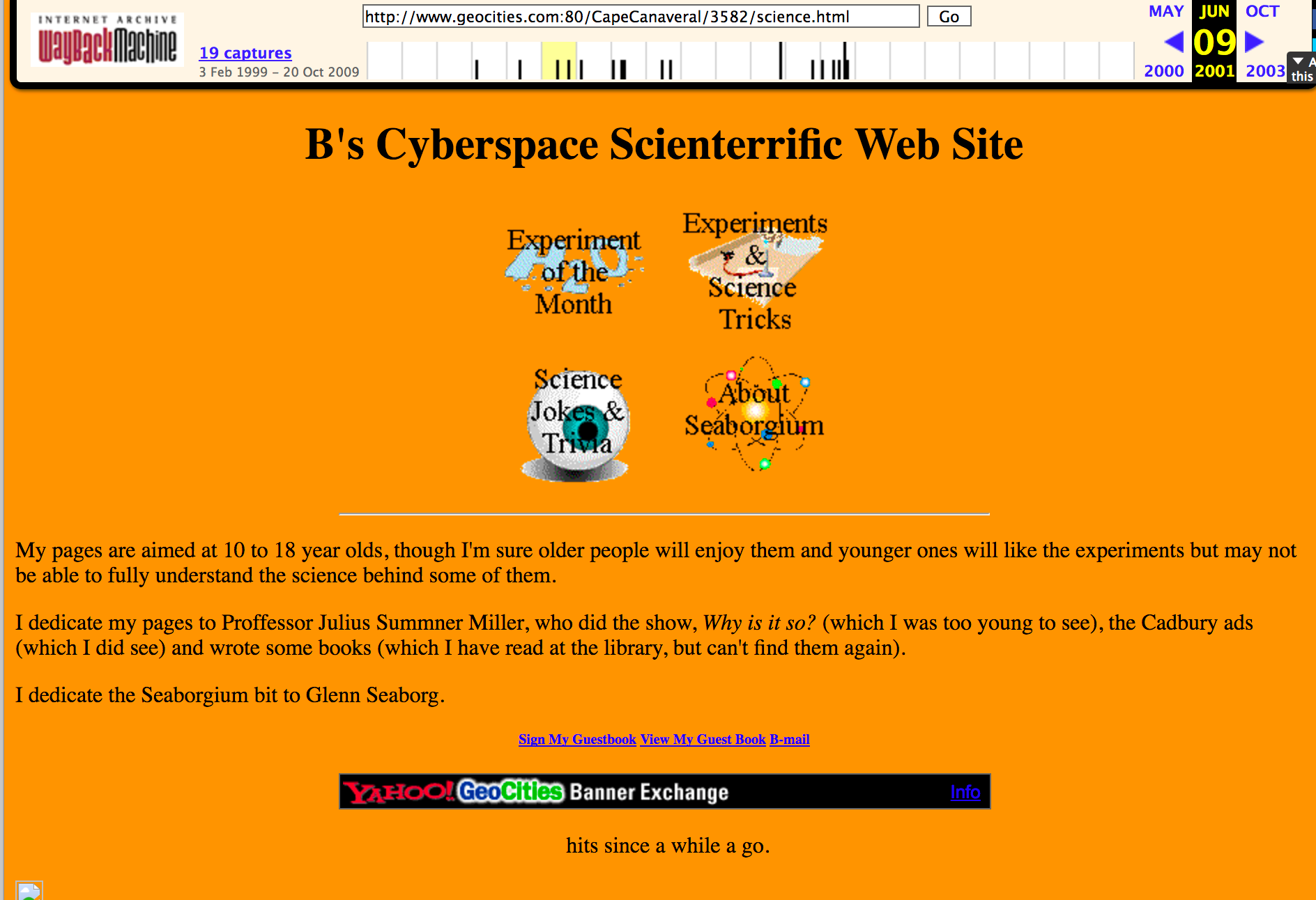 I'm glad some folks archived Geocities. I have needed some old versions and found some interesting things with them. There was a lot of content lost... the people of the future are going to want to check out at least some of this. That's why I just blockchained some of my site. It's 20 years later, and my memory is already foggy. With the Wayback Machine, my records, and my original files, I can get a good picture of it for you folks.