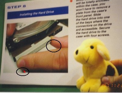 One manufacturer had about a dozen large pictures along a wall depicting how to install a motherboard and configure a system. This poster caught my eye, because the hard disk cable is being put on backwards. I have highlighted where the red stripe is (I retouched the scanned image so you can see the red better), and you can easily see that it is on the wrong side. Nice picture, but too bad this hard disk won't work. Spot, in the foreground, chuckles.