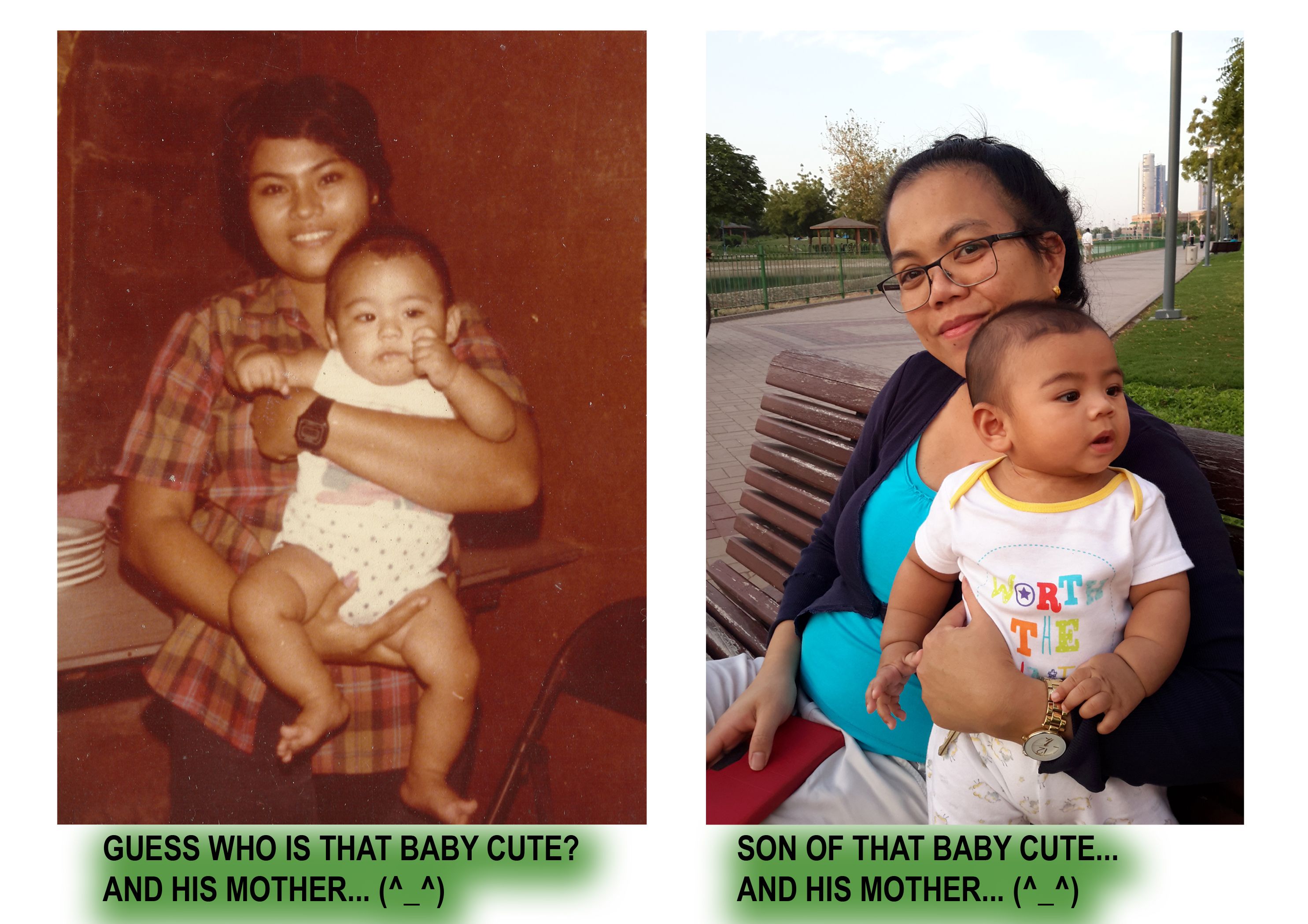 From left is my Mother and I... From right is my wife @arrliinn and my youngest son... In my country when i was born, we called that "Pinag biyak na bunga" in english is "Half of the fruit" because of their similarity when they are a child until they grow up. Hehehehehe...😂😄😂