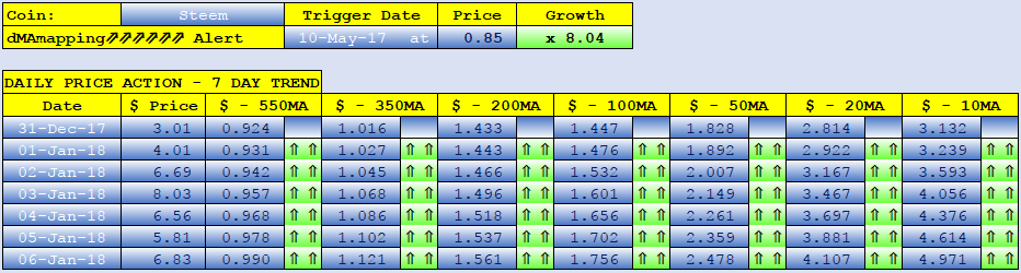Congratulations to all those that picked up on the dMAmapping⇗⇗⇗⇗⇗⇗ alert for Steem at $1.61 with a Year End Target of $4.70. Current price = $6.83. Remains bullish.