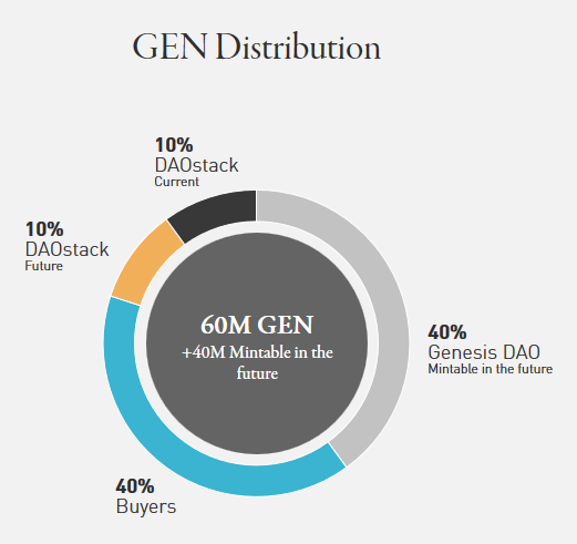 GEN è il token nativo dell'ecosistema DAOstack e tutte le operazioni, dal promuovere proposte a costruire la propria DAO richiederanno il token GEN. La supply totale è di 100 milioni di token di cui 60 milioni suddivisi tra la vendita di token (40M), 20 milioni riservati al team per sviluppo corrente e futuro più 40 milioni che saranno coniate in futuro.