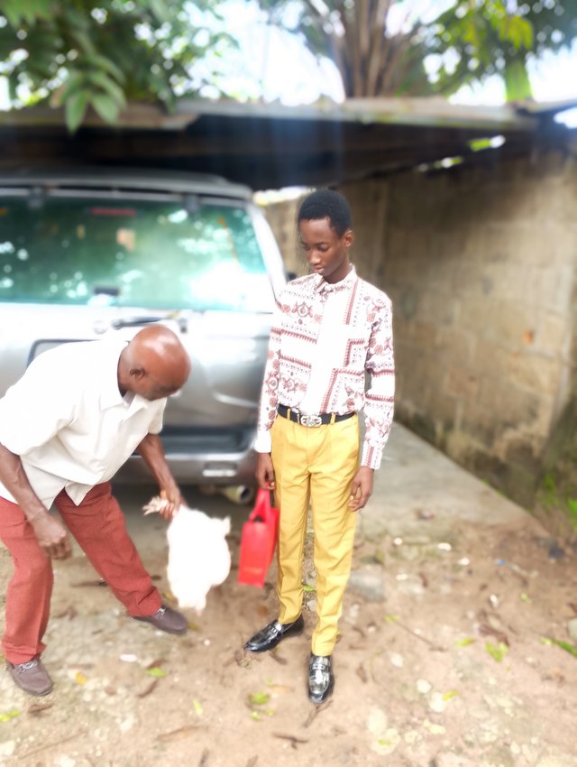 The most significant change, however, is captured when the focus moves from self to interaction. In these images, an elder gentleman walks into the frame, carrying a red bag and a large, dressed chicken.