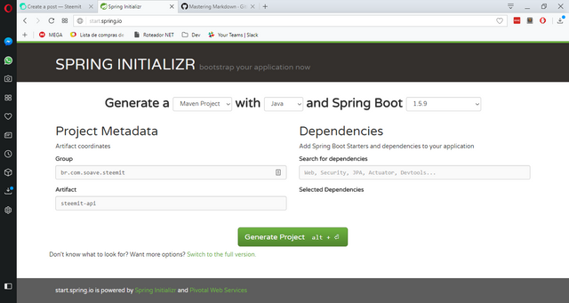 Primeiramente, vamos acessar o site do SPRING INITIALIZR. Ele irá criar o esqueleto do nosso projeto já com as tecnologias que iremos utilizar. Basta ir adicionando as libs necessárias (de acordo com o que o Spring oferece) que o projeto virá praticamento pronto par ser utilizado. Como nossa aplicação é bem simples, a principio nenhuma dependência precisa ser incluída. Iremos gerar o projeto no padrão Maven Project, with Java e Spring 1.5.9.