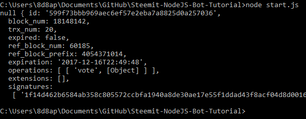 Change directory in the Command Prompt to the GitHub folder containing the Steemit-NodeJS-Bot-Tutorial repository with the cd (change directory) command: