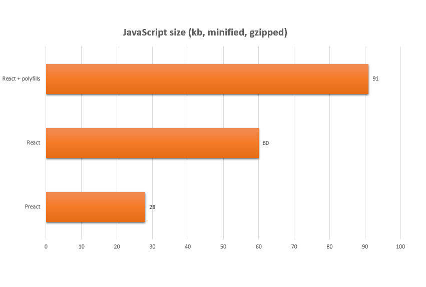 Be that as it may, I feel like a diagram, so here's the record size of my application + React with all the polyfills versus without and afterward with the minor Preact.