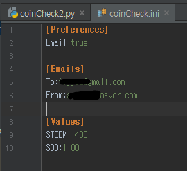 우선 Script를 수행하기 전에 아래와 같이 coinCheck.ini 파일을 작성해 주어야 합니다.