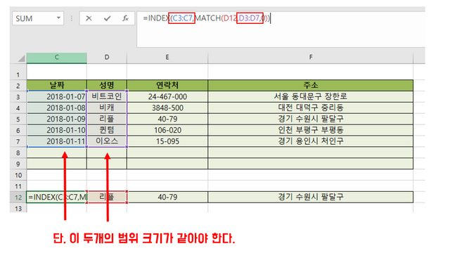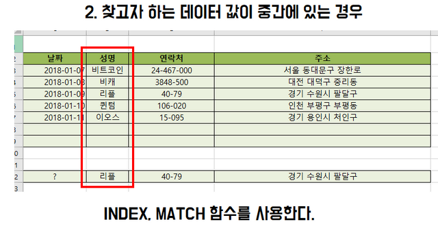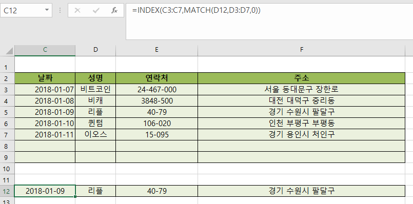 자 그렇다면 이제 INDEX, MATCH 함수를 짬뽕해서 데이터를 찾아보겠습니다.