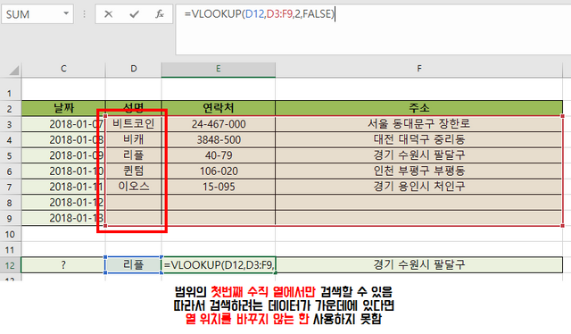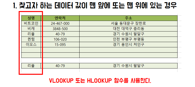 - 검색할 값 : 검색할 값 입니다. 위 표를 참조하자면 "리플"이 되겠죠?