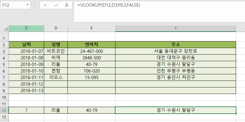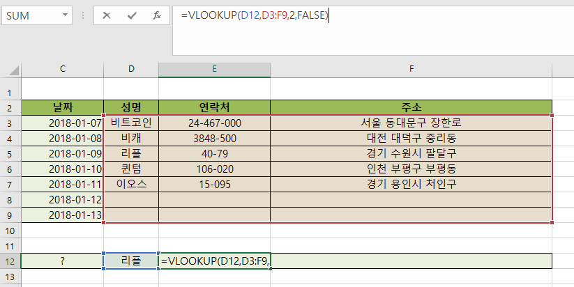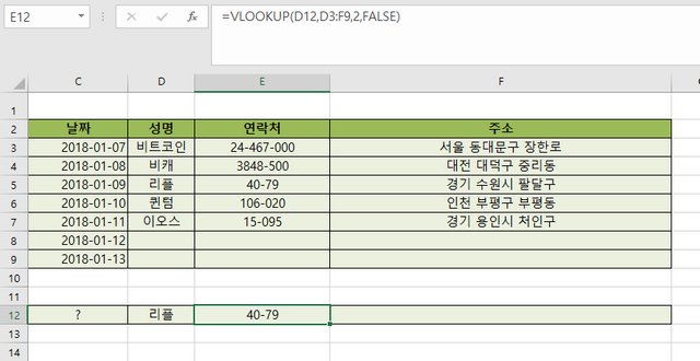 - 일치여부 : TRUE나 FALSE 값을 넣을 수 있는데 TRUE는 근사값, FALSE는 정확한 값을 찾아냅니다. 보통 FALSE를 많이 사용합니다.