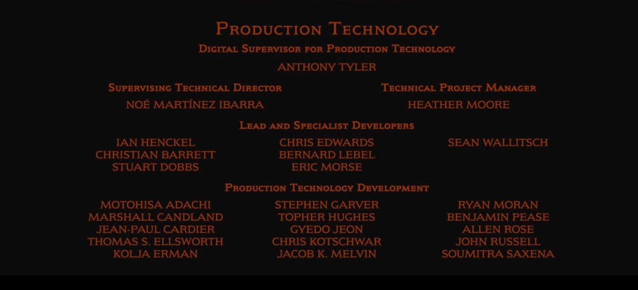 이 작품에서 저는 감사하게도 엔딩 크레딧에 이름이 두 번 올라갔는데요, 작품에 나중에 잠깐 Technical Director로 도왔다고 "Additional Technical Directors"라는 섹션에 한번 올라갔구요.