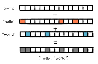 Bloom Filter의 원리는 비교적 간단합니다. 해싱 함수를 이용해서 원소를 해싱한 다음, 위 그림처럼 모두 더하는 겁니다.