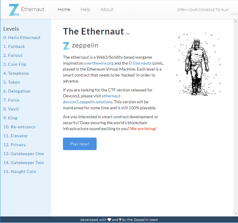 OpenZeppeline과 Smart Contract Auditing으로 유명한 Zeppeline team에서 제공하고 있는 서비스입니다. 총 15단계로 이뤄져 있고, 각 단계마다 취약점 미션 풀이를 위해 필요한 취약점을 찾아야 합니다.