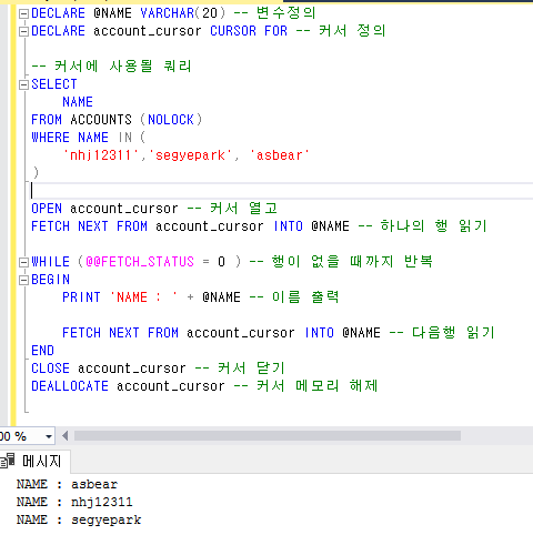 FETCH NEXT FROM account_cursor INTO @NAME -- 하나의 행 읽기