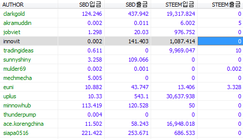 11월 kr 포스팅 유저의 스팀과 SBD 총 입출금 리스트
