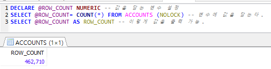 SELECT @ROW_COUNT= COUNT(*) FROM ACCOUNTS (NOLOCK) -- 변수에 값을 담는다.