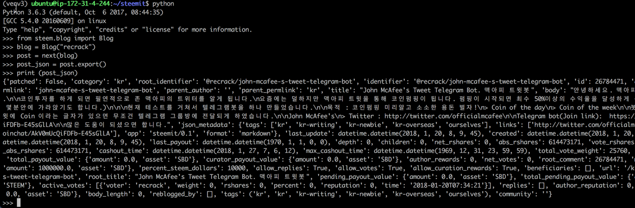 (참고 : https://steemit.com/kr-dev/@tmkor/steem-api-with-python)