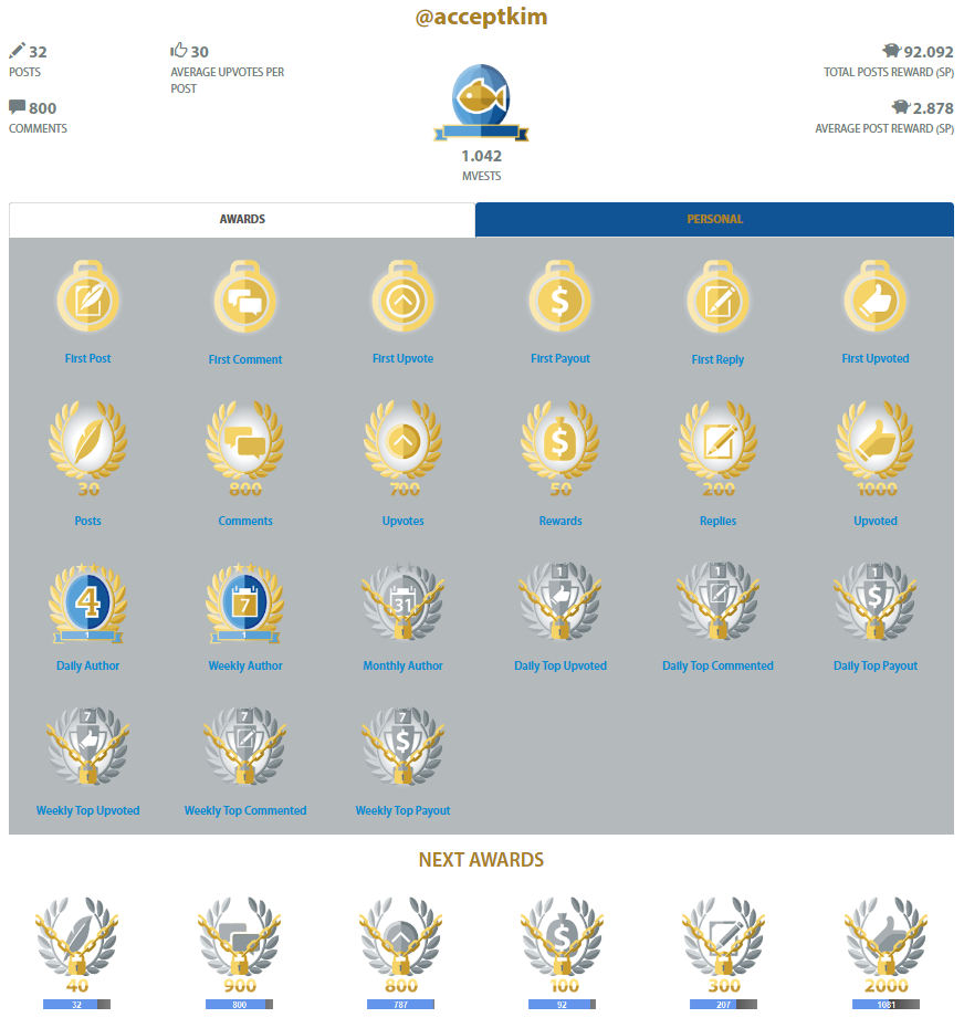 저는 아직 물고기고, 아래와 같은 업적들을 달성했네요. 800comment, 700upvot, weekly author 등등... 물론 여기서 정한 기준이라 어떻게 선정되는진 저도 잘 모르겠습니다ㅋㅋㅋ