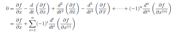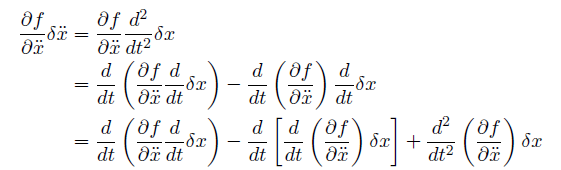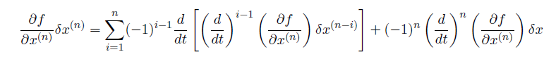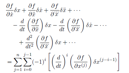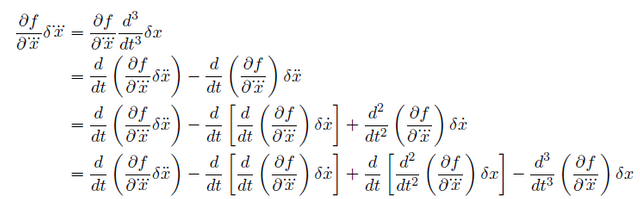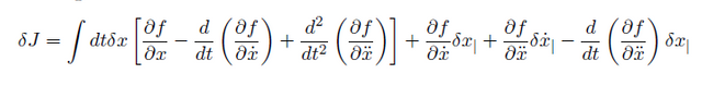 다만 그냥 물리학에서 말하는 action 과 거기에 대응되는 라그랑지안은 t, x, dot{x} 까지만 관련있는 반면 여기서 내가 하고 싶은 계산은 한번 시간 미분한 속도 텀보다 더 나아가 두번 미분인 가속도, 그 외의 n 번 미분한 항이 들어가면 운동방정식이 어떻게 바뀌고 boundary term 이 어떻게 구해지는가에 대한 계산을 해보려고 한다.