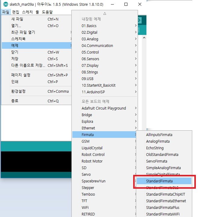 [1단계] 파일->예제->Firmata -> StandardFirmata 를 눌러줍니다.