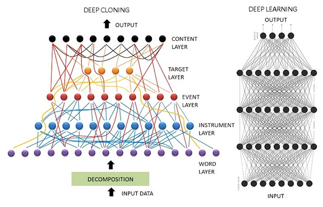텍스트를 읽은 후 자연 언어를 처리하고 지식으로 전환될 때, 딥 클로닝 네트워크 (그림 왼쪽)는 서로 다른 목적과 다양한 뉴런 기능을 가진 계층으로 구성됩니다. 이와는 대조적으로, 딥러닝 (그림 오른쪽)은 주시된 학습 모드에서 산출물의 오류를 최소화하기 위해 설계된 뉴런의 동질 구조입니다. 딥러닝의 변동성에도 불구하고 어떠한 언어적 역할에도 뉴런 활동이 지정되지 않습니다.