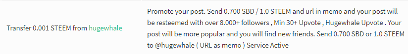 Promote your post. Send 0.700 SBD / 1.0 STEEM and url in memo and your post will be resteemed with over 8.000+ followers , Min 30+ Upvote , Hugewhale Upvote . Your post will be more popular and you will find new friends. Send 0.700 SBD or 1.0 STEEM to @hugewhale ( URL as memo ) Service Active.